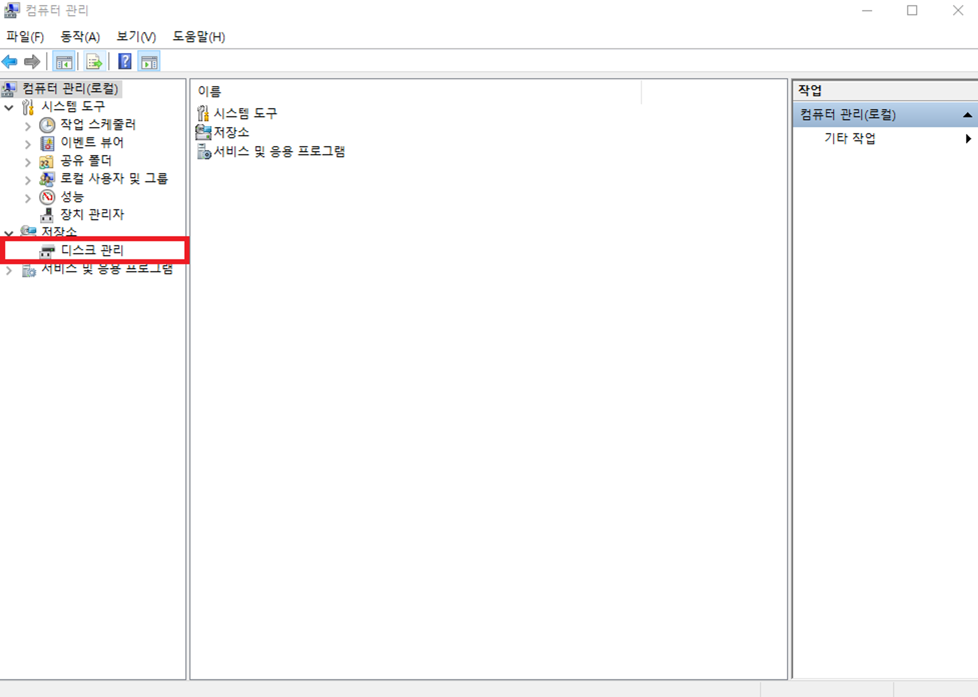 단계 2. [컴퓨터 관리]창에서 [저장소] 밑에 있는 [디스크 관리]를 클릭합니다. 창이 열리면 외장하드를 컴퓨터나 노트북에 연결합니다.