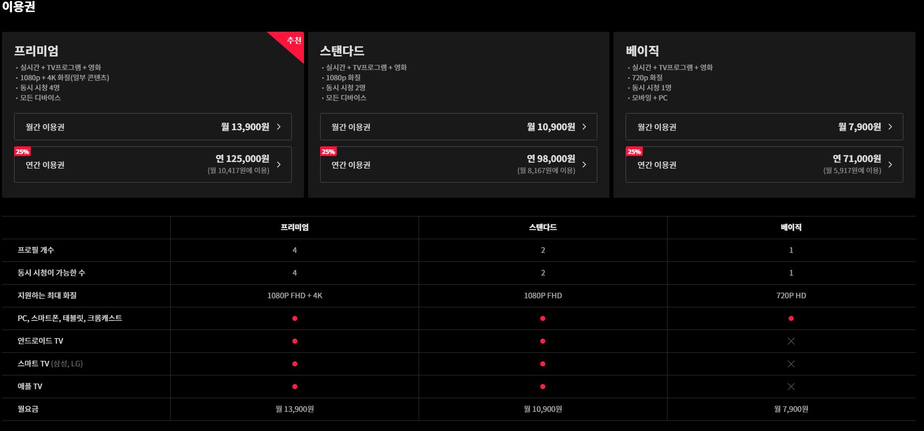 스탠다드는 스마트TV로 시청이 가능하고, 화면해상도는 1080p, 동시 시청 가능수는 2명까지 가능합니다. 프리미엄 역시 스마트TV 시청 가능, 해상도 4K, 동시 시청가능수는 4명까지 가능합니다. 단, 여기서 4K UHD 화질은 스마트TV와 안드로이드TV, 애플TV에서만 제공됩니다.