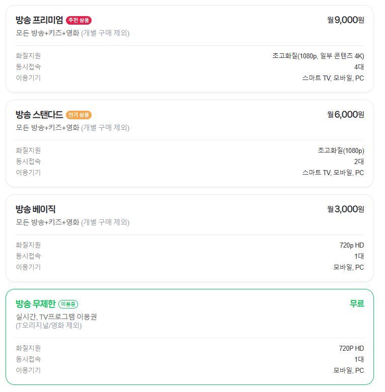티빙 요금제(가격)는 베이직(월 9,000원), 스탠다드(월 12,500원), 프리미엄(월 16,000원) 3가지 옵션이 있습니다.