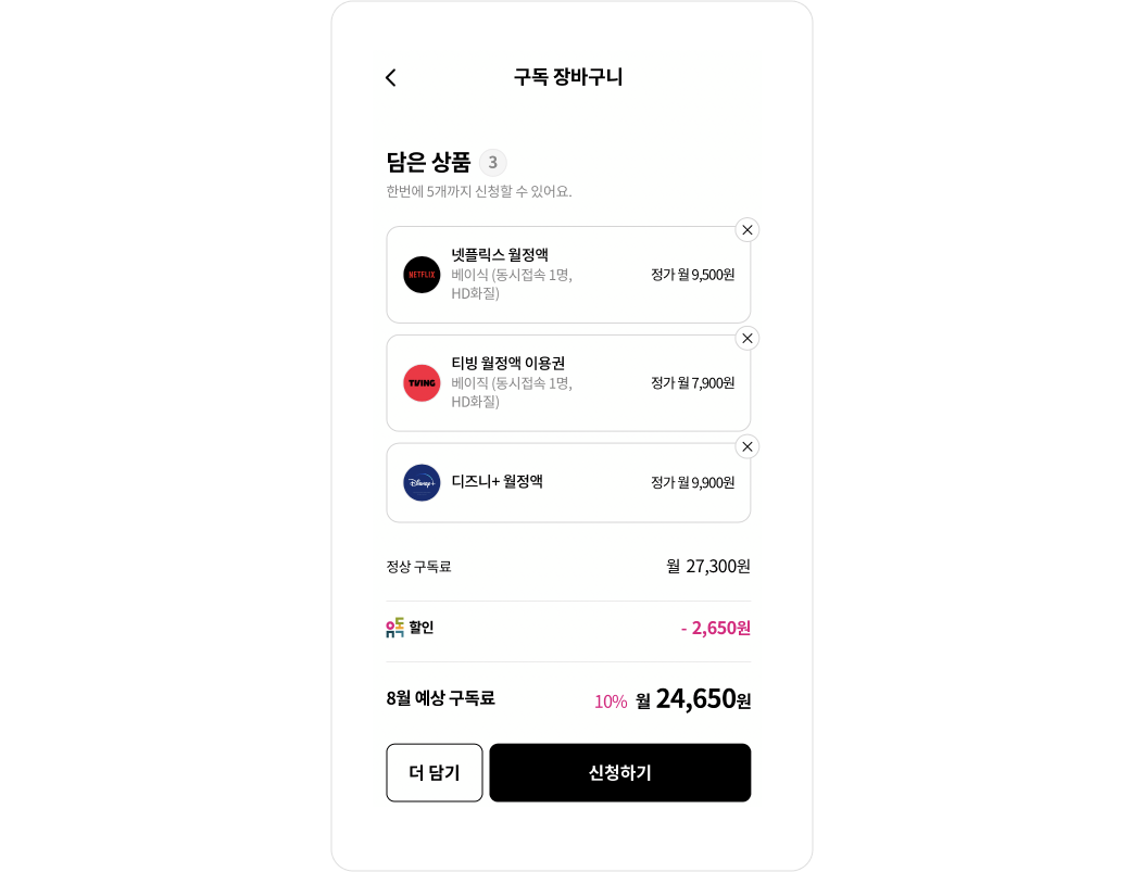 유독은 라이프 스타일에 맞춰 원하는 구독 서비스를 골라 선택한 뒤 다양한 혜택을 받을 수 있는 서비스입니다. OTT뿐만 아니라 배달이나 쇼핑, 여가, 뷰티 등 본인의 라이프 스타일에 맞춰 여러 가지 서비스를 신청할 수 있는데요. 하나의 서비스만 선택해도 매달 최소 5%의 할인을 받을 수 있고 2개 이상을 선택할 경우 매월 최대 50%의 이용료를 할인 받을 수 있습니다. 통신사 상관없이 누구나 혜택을 받을 수 있다는 점에서 큰 메리트가 있는데요. (단, 일부 상품 제외)
