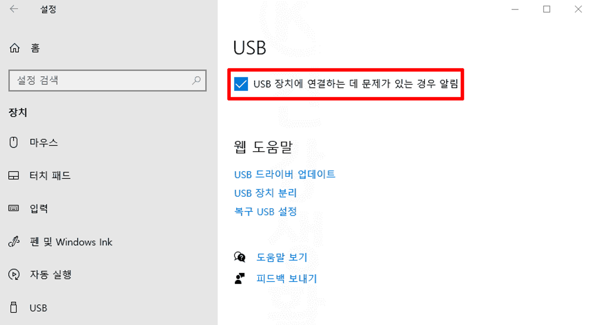 4. USB 장치에 연결하는 데 문제가 있는 경우 알림을 체크합니다.