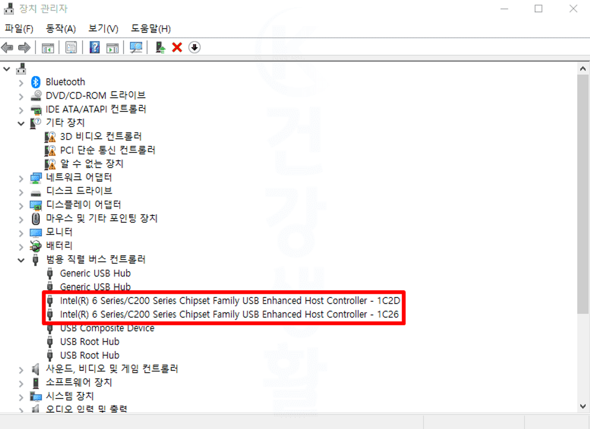 인텔제품을 일 경우 Intel(R) Series USB와 같은 형태로 2개의 포트가 보여지는 것을 볼 수 있습니다. 만약 다른 메인보드를 이용하고 계시다면 이름이 조금 다를 수 있지만 뒤의 'Controller'가 붙은 것이 사용가능한 USB 포트를 의미하니 찾는데 어려움이 없습니다. 만약 USB 포트가 보이지 않는다면 해당 메인보드 제조사 사이트에서 드라이버를 찾아서 최초 설치를 진행하셔야 합니다.