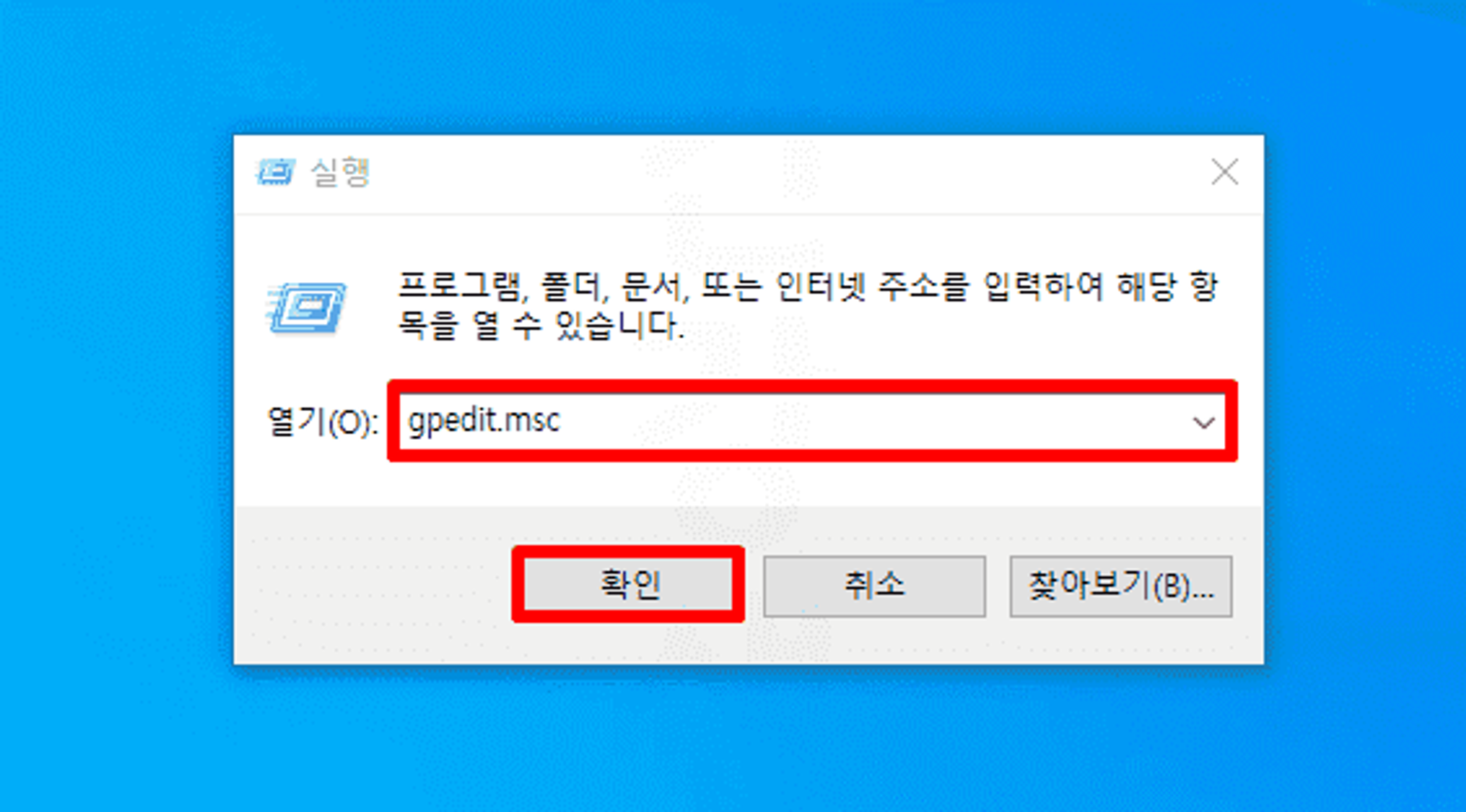 2. gpedit.msc를 입력한 후 확인을 클릭합니다.