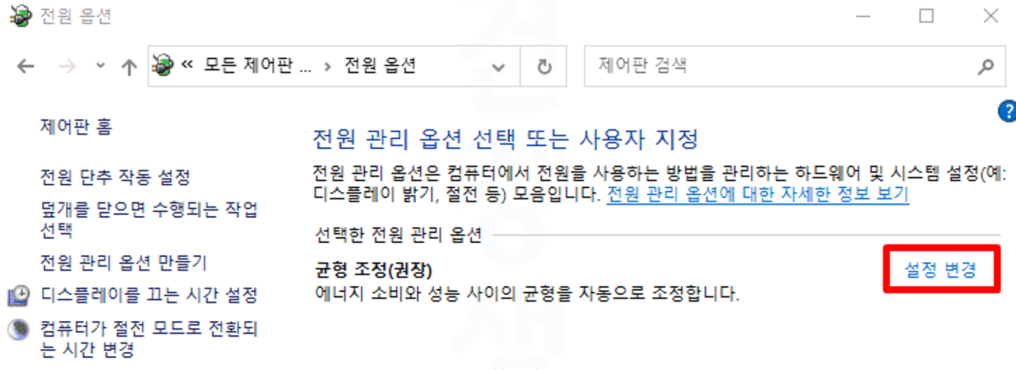4. 전원 관리 옵션에서 설정 변경을 누릅니다.