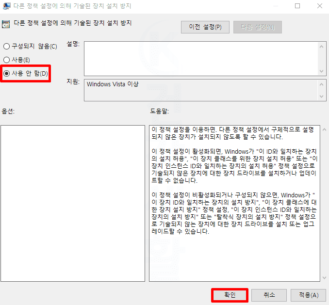 컴퓨터에서 USB 인식 안될때, 다른 정책 설정에 의해 기술된 장치 설치 방지 기능이 활성화되어 있지는 않은지 확인해 보는 것이 좋습니다. 이 기능으로 컴퓨터 USB 포트의 장치로 드라이버 설치 및 업데이트를 막기 때문에 인식이 실패될 수 있기 때문입니다. 아래 방법으로 장치 설치 방지 기능을 끔으로 설정하시길 바랍니다.