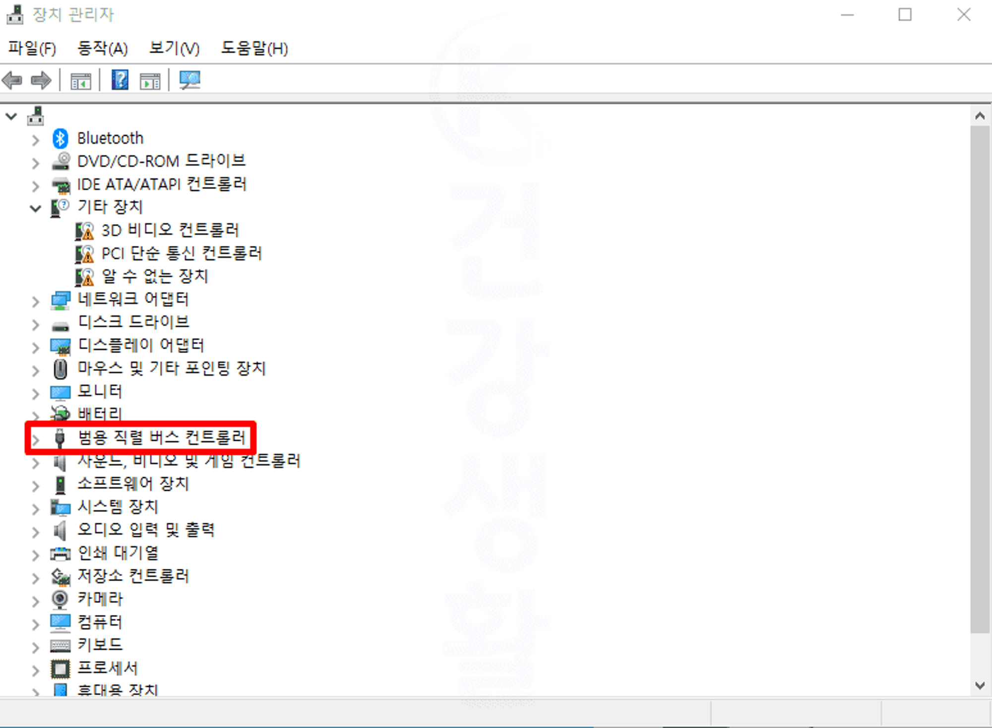 2. 범용 직렬 버스 컨트롤러를 찾아서 더블 클릭합니다.